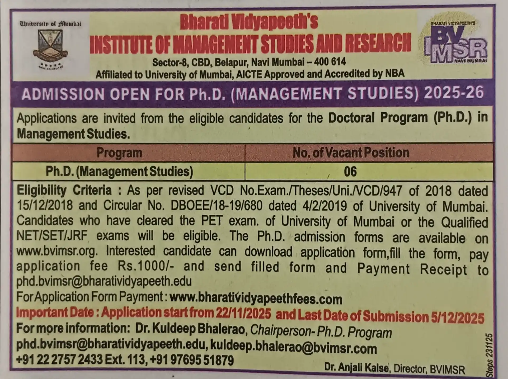 Bharati Vidyapeeth’s Institute of Management Studies and Research has launched the Ph. D. Program in Management Studies which is affiliated to the University of Mumbai, Mumbai.